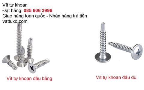 Vít tự khoan đầu lục giác, đầu bằng, đầu dù, đầu tròn,…Các loại vít này được sản xuất với kích thước đa dạng nên có thể áp dụng cho rất nhiều vị trí liên kết khác nhau.
